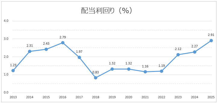 - 配当利回りは低め(なかなか3%超えない)