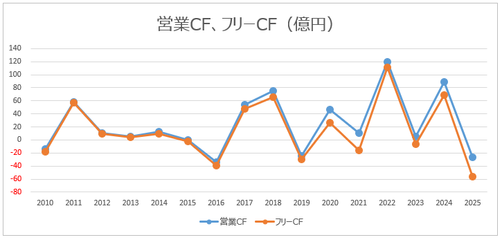 - 営業キャッシュフロー、フリーキャッシュフローともに、2、3年ごとにマイナス