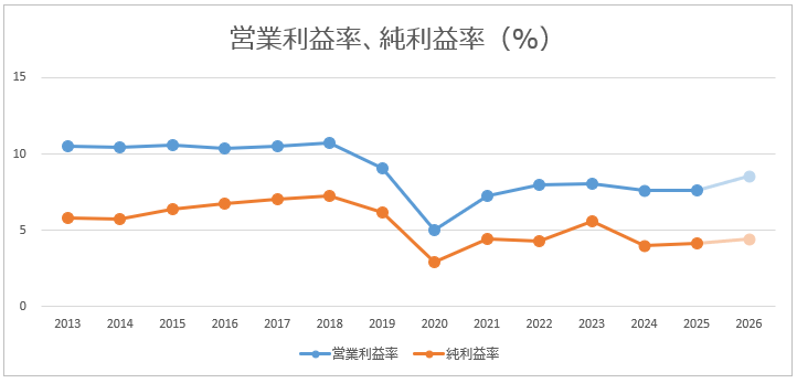 - 営業利益率は、コロナ禍前の水準(10%程度)に戻せていない